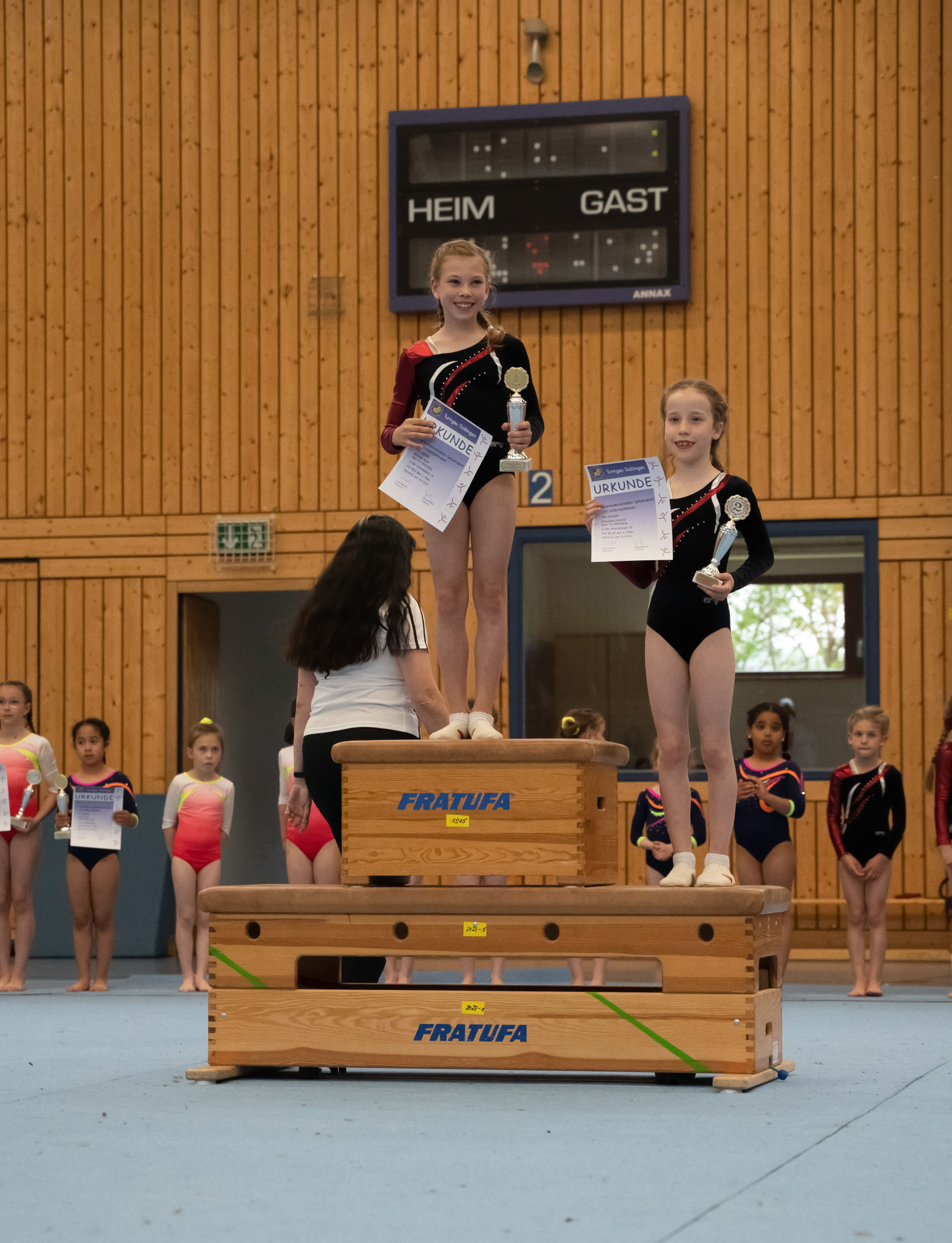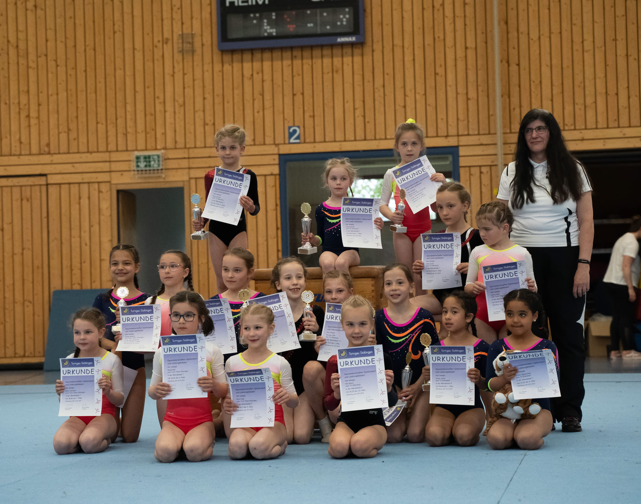 Auf der 2. Veranstaltung des Turnvereins am 25.06.22 starteten 161 Teilnehmerinnen zum Wettkampf im Gerätturnen in den Disziplinen Boden, Sprung, Balken und Barren getrennt nach Altersklassen. Die Sporthalle war gut gefüllt, viele Eltern und Großeltern waren mitgekommen, um die Leistungen der Kinder mit viel Applaus zu unterstützen. Für den Turnverein waren 20 Teilnehmerinnen am Start. Für den reibungslosen Ablauf sorgten Alexandra Gamber und Anna Forsch. Zwischen 9 und 18 Uhr wurde in mehreren Riegen um die besten Platzierungen gerungen. Bei den Siegerehrungen wurde mit Urkunde und Pokal und viel Beifall gratuliert. Die Teilnehmerinnen des Turnvereins erzielten durchweg gute Platzierungen und freuten sich mit ihren Trainerinnen über den erzielten Rang. Besonders stark waren die Kinder des Jahrgangs 2013, die für den Turnverein viele Spitzenplätze holten. Viele freiwillige Hände sorgten für Auf- und Abbau und das leibliche Wohl der Gäste.
